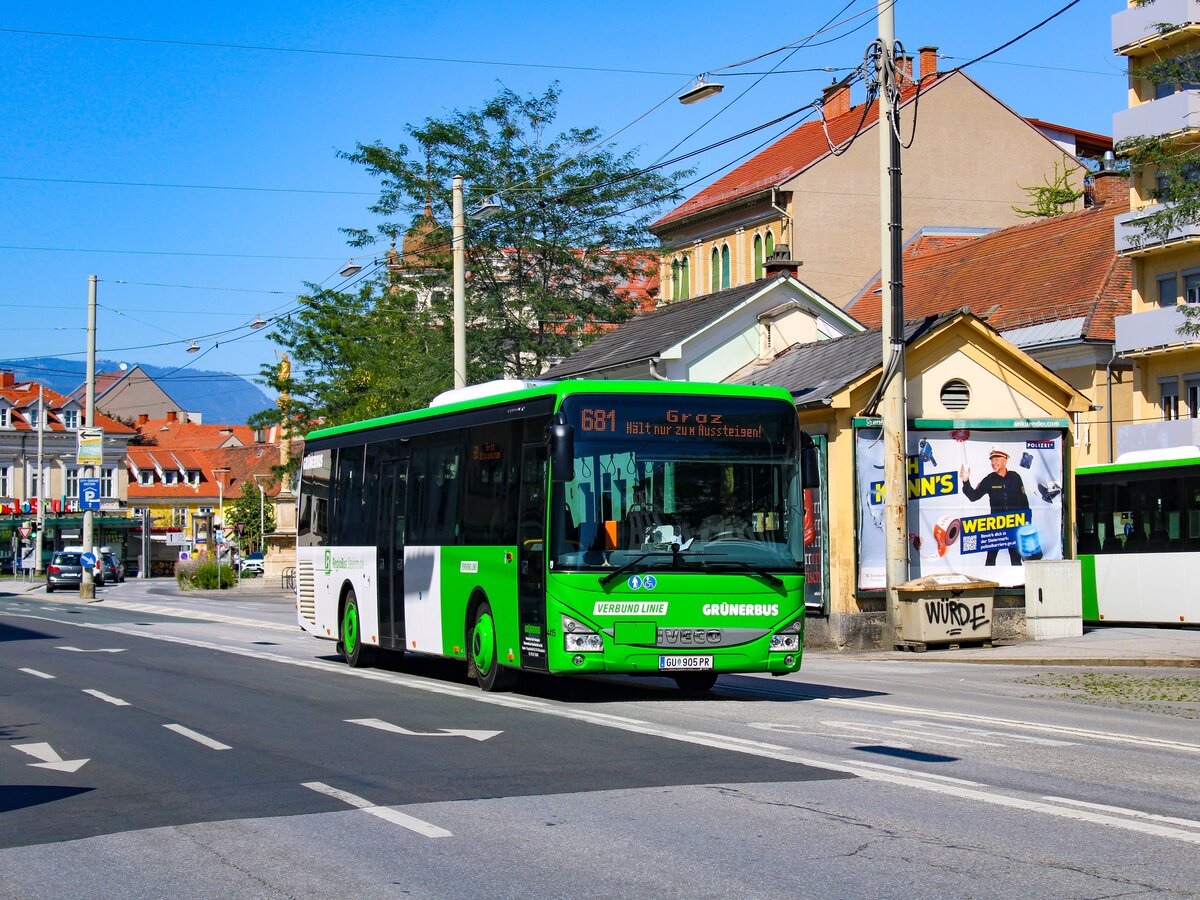 Graz. Ein Iveco Crossway von Grünerbus ist hier am 14.08.2023 als Linie 681 am Griesplatz zu sehen.