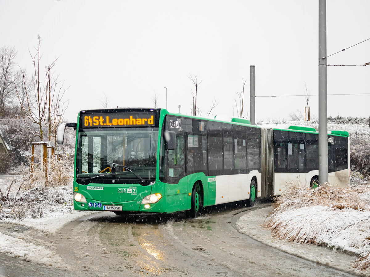 Graz. Am Vormittag des 02.12.2023 hat es in der steirischen Hauptstadt ordentlich geschneit – Wagen 25 der Graz Linien ist hier als Linie 64 beim Verlassen der Haltestelle Puntigam zu sehen.