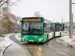 Graz. Am Vormittag des 02.12.2023 hat es in der steirischen Hauptstadt ordentlich geschneit – Wagen 31 der Graz Linien ist hier als Linie E5 beim Verlassen der Haltestelle Puntigam zu sehen.