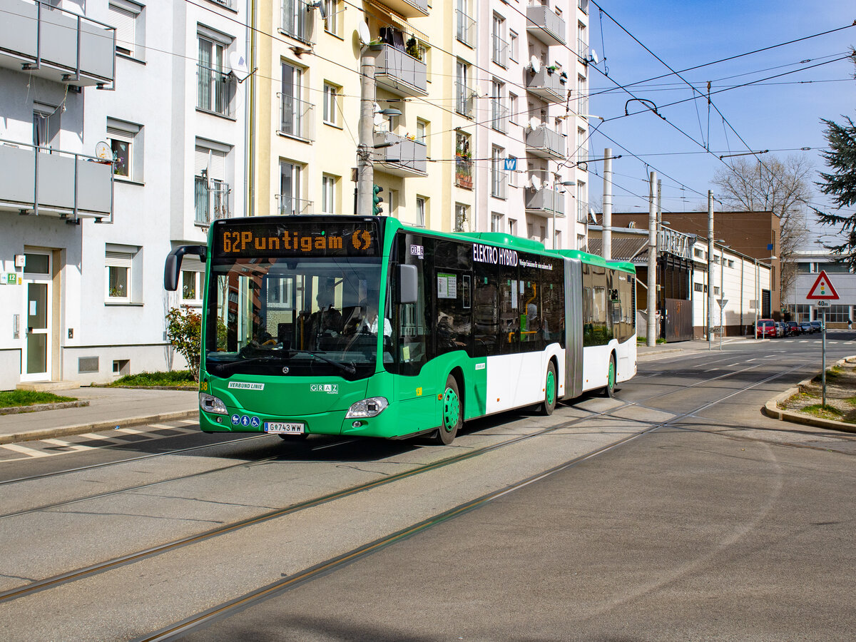 Graz. Wagen 138 der Graz Linien ist hier am 26.03.2024 als Linie 62 in der Laudongasse zu sehen.
