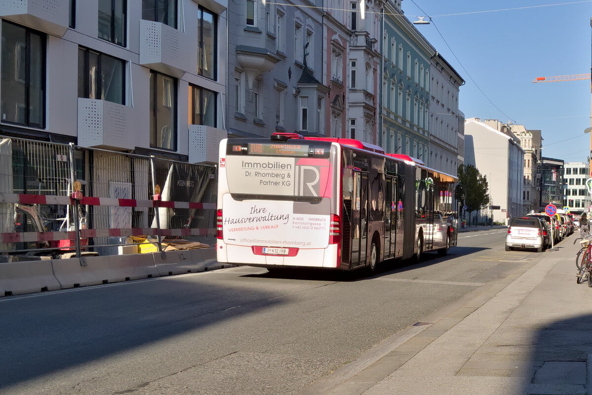 Innsbruck: Mercedes-Benz Citaro Facelift der Innsbrucker Verkehrsbetriebe, Bus Nr. 412, als Zubringer Stadion in der Heiliggeiststraße. Aufgenommen 3.9.2021.