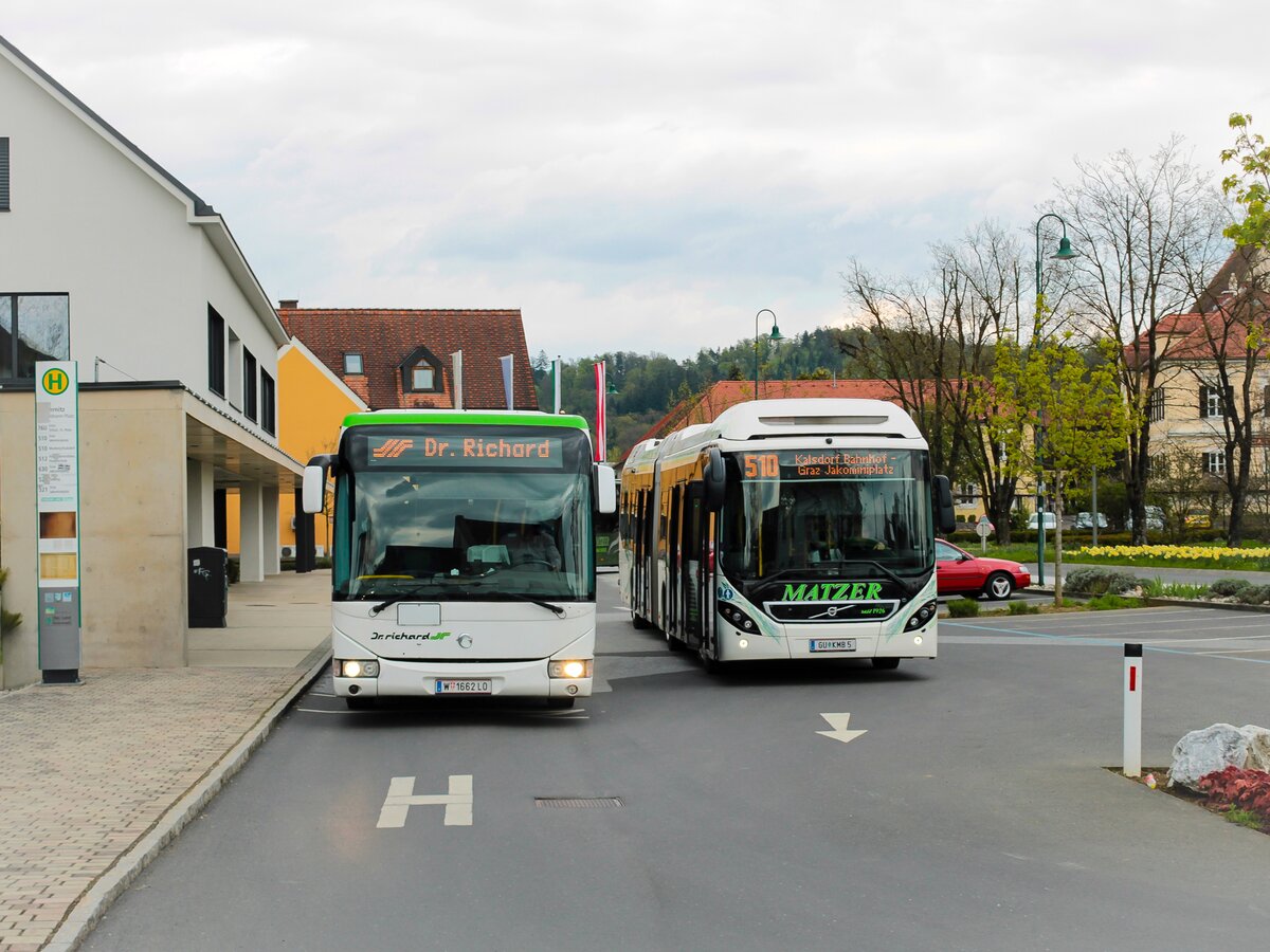 Fernitz-Mellach. Am 27.04.2023 steht der Wagen 5870 von Dr. Richard als Linie 521 am Erzherzog-Johann-Platz.