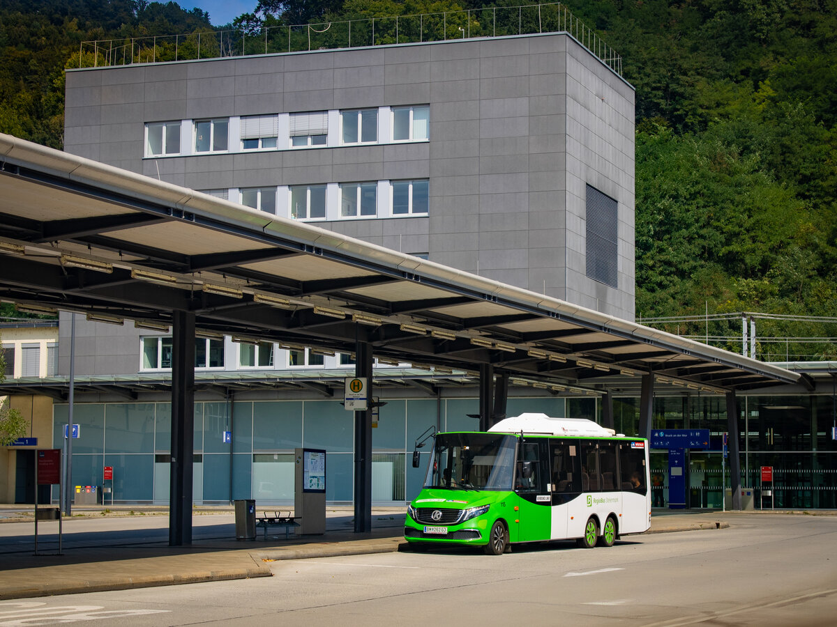 Bruck an der Mur. Der Kutsentis E-Solar City der Mürztaler Verkehrsgesellschaft steht hier am 01.09.2024 als Linie 1 im Bahnhof Bruck an der Mur.