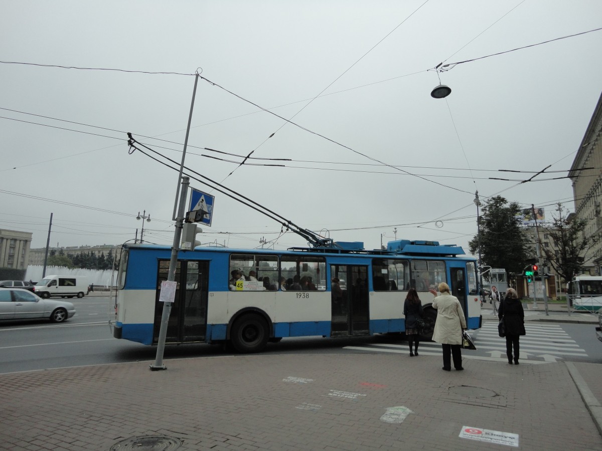 O-Bus 1938 am 11.9.2013 in St. Petersburg/Russland. Beachtenswert ist auch die Stromführung zu den Ampelmasten, auch ein angefahrener und schiefer Mast stört niemanden.