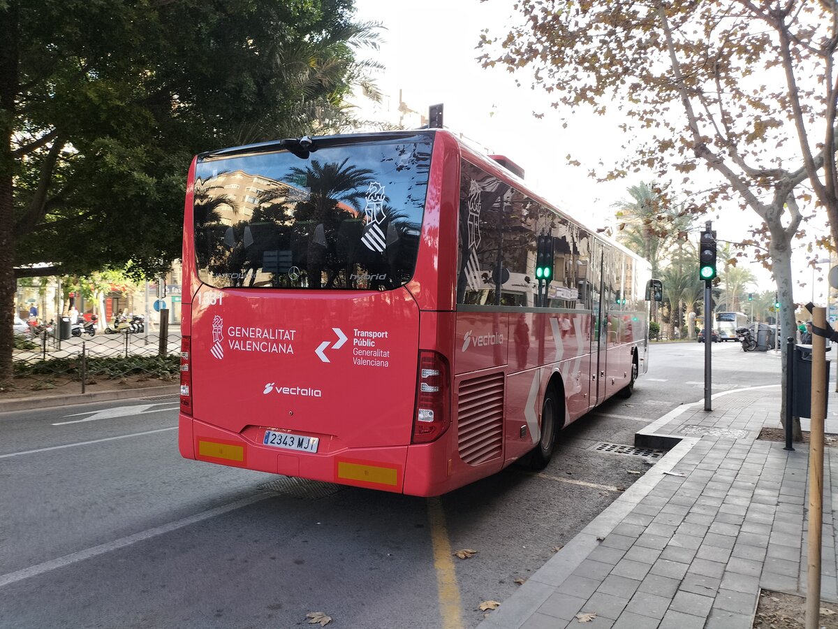 Mercedes-Benz Intouro III als Busverbindung zwischen Alicante und Elche. In den kommenden Jahren soll die Tramlinie diese Strecke übernehmen. Das Neufahrzeug verlässt die Haltestelle in der Avenida Oscar Esplá in Alicante am 12.12.2023.