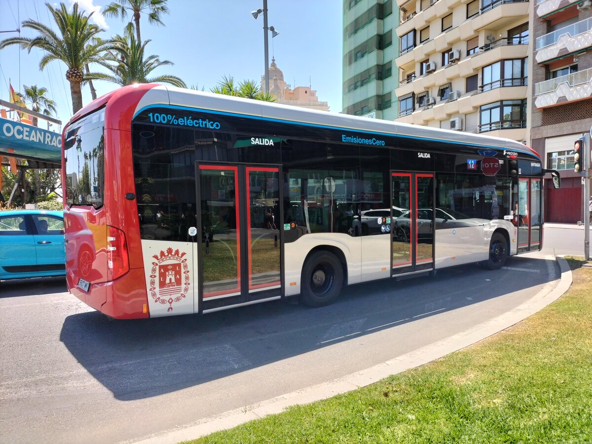 Mercedes-Benz eCitaro, Wagen 1001, Vectalia Mia, am Plaza Puerta del Mar als Linie 12 in Alicante am 15.05.2024