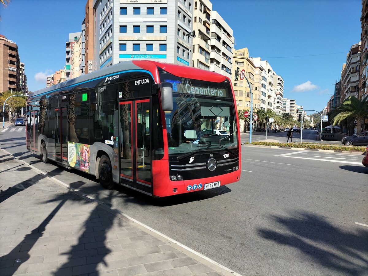 Mercedes-Benz eCitaro, Vectalia Mia, Wagen 1004, unterwegs in der Avenida Salamanca als Linie 4 in Alicante am 21.10.2024