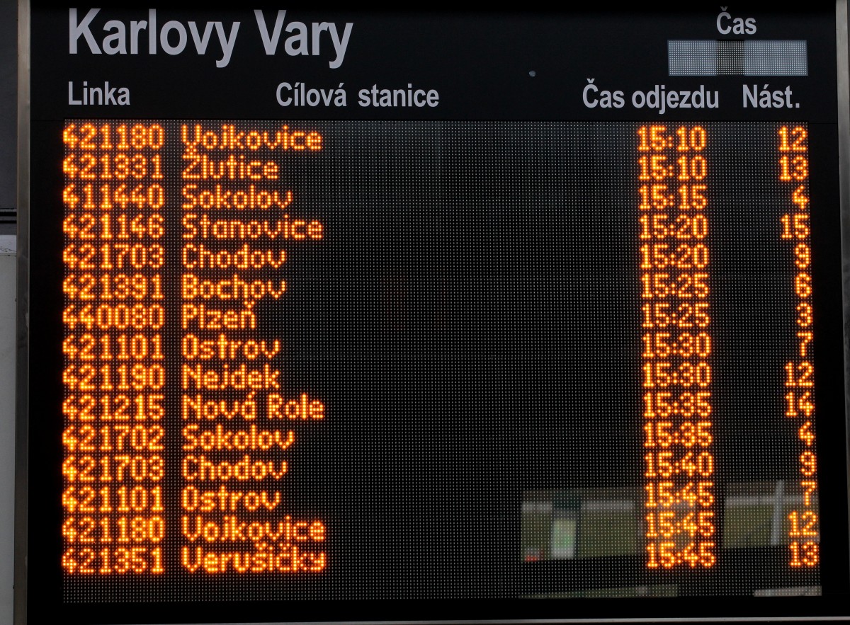 Busabfahrtstafel in Karlovy Vary, Dolni Nadrazi. 08.02.2016  15:06 Uhr.