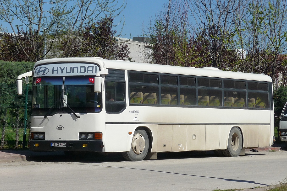 Ein großer HYUNDAI AeroCITY540 Stadtbus parkt am Botanischen Garten von Inegöl, 3.4.2016