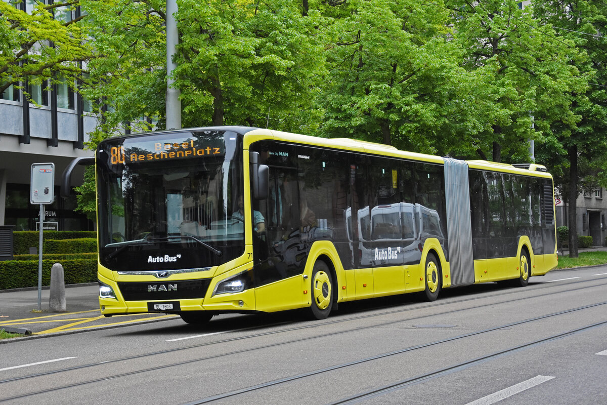 MAN Lions City 71 der AAGL, auf der wegen einer Baustelle umgeleiteten Linie 80, fährt zur Endstation am Aeschenplatz. Die Aufnahme stammt vom 05.05.2022