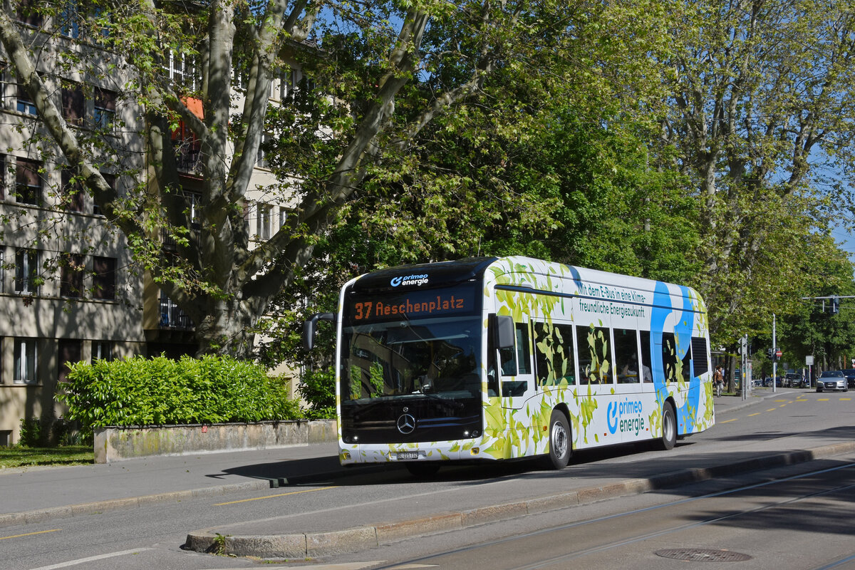 Mercedes eCitaro 1002 mit der Werbung: Mit dem E-Bus in eine Klimafreundliche Energiezukunft, auf der Linie 37, fährt zur Endstation am Aeschenplatz. Die Aufnahme stammt vom 31.05.2021.