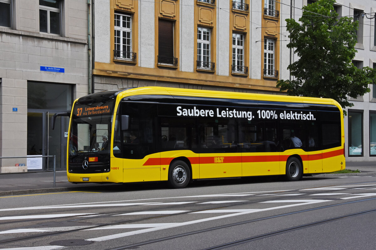 Mercedes eCitaro 1001, auf der Linie 37, wartet an der Endstation am Aeschenplatz. Die Aufnahme stammt vom25.05.2021.