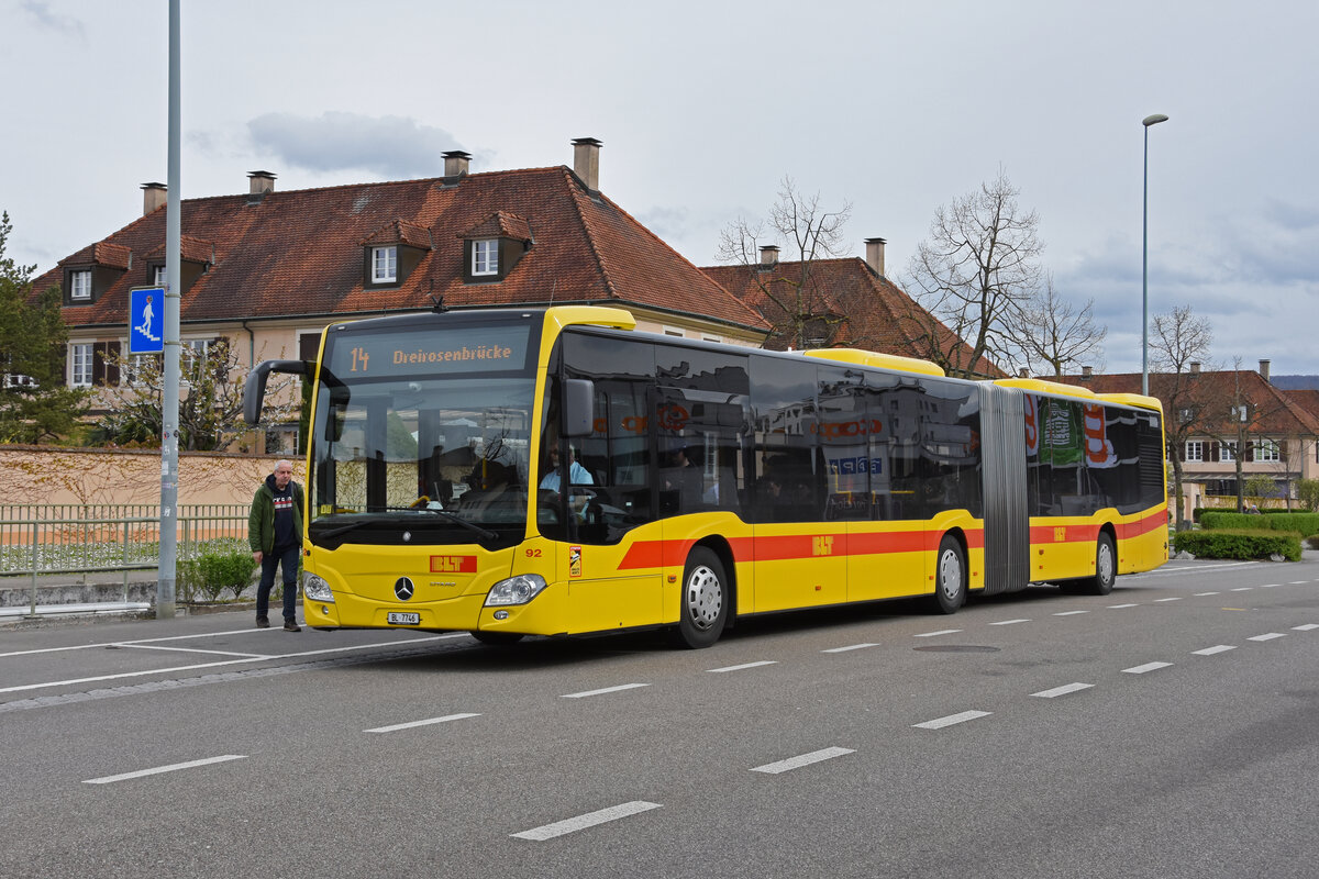Mercedes Citaro 92 der BLT, auf der Tramersatzlinie 14, die wegen einer Grossbaustelle nicht mit Tramzügen fahren kann, bedient am 11.04.2023 zur Provisorischen Haltestelle Freidorf.