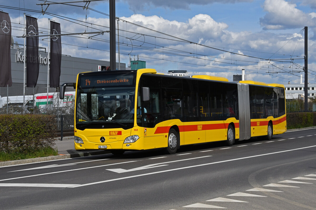 Mercedes Citaro 92 der BLT, auf der Tramersatzlinie 14, die wegen einer Grossbaustelle nicht mit Tramzügen fahren kann, bedient am 14.04.2023 die provisorische Haltestelle Lachmatt.