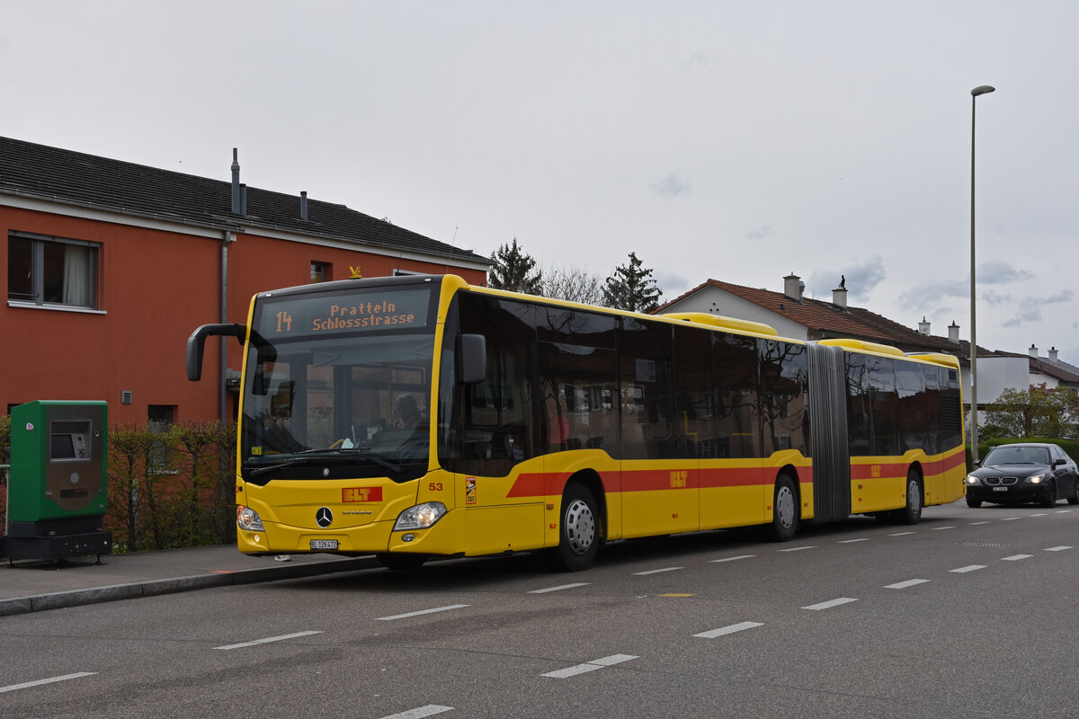 Mercedes Citaro 53 der BLT, auf der Tramersatzlinie 14, die wegen einer Grossbaustelle nicht mit Tramzügen fahren kann, bedient am 11.04.2023 die provisorische Haltestelle Freidorf.