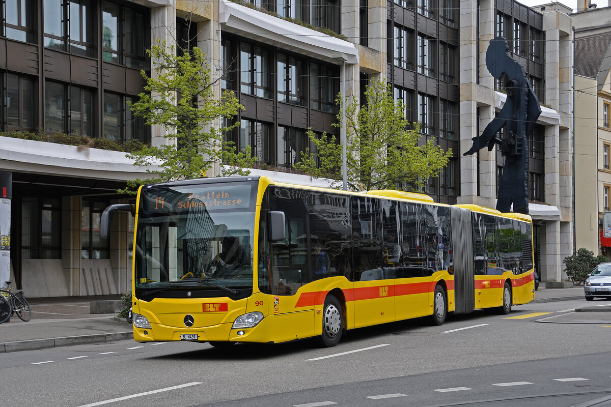 Mercedes Citaro 90 der BLT, auf der Tramersatzlinie 14, die wegen einer Grossbaustelle nicht mit Tramzügen fahren kann, fährt am 26.04.2023 zur Endstation am Aeschenplatz.