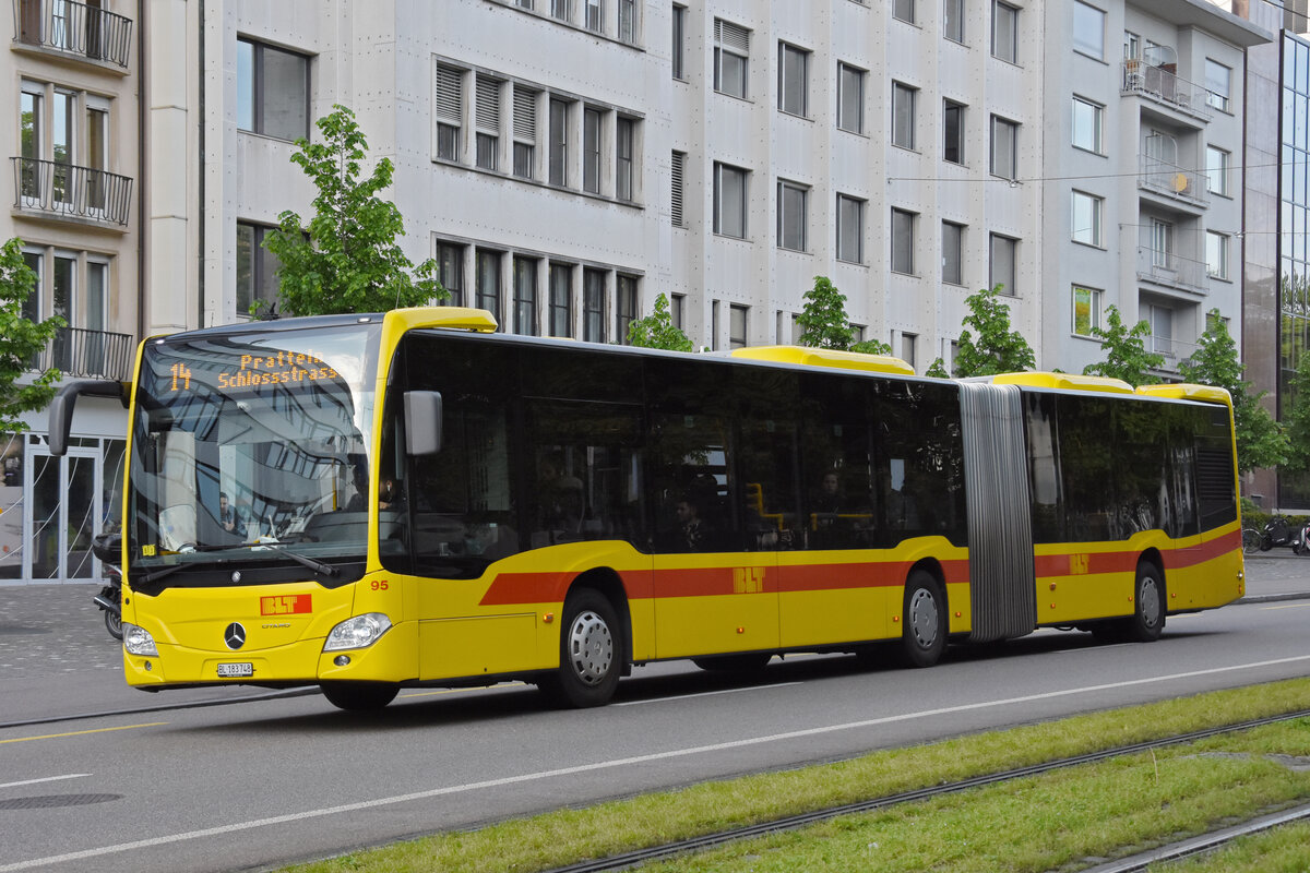 Mercedes Citaro 95 der BLT, auf der Tramersatzlinie 14, die wegen einer Grossbaustelle nicht mit Tramzügen fahren kann, fährt am 17.05.2023 zur provisorischen Haltestelle Seevogelplatz.