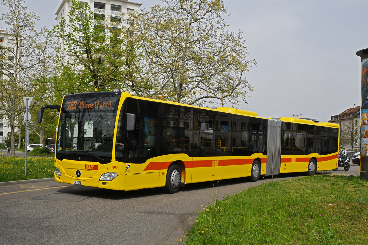 Mercedes Citaro 90 der BLT fährt am 08.04.2024 als Tramersatz auf der Linie 3, die wegen einer Grossbaustelle am Steinenberg nicht Richtung Barfüsserplatz fahren kann. Hier wendet der Bus am Kannenfeldplatz.