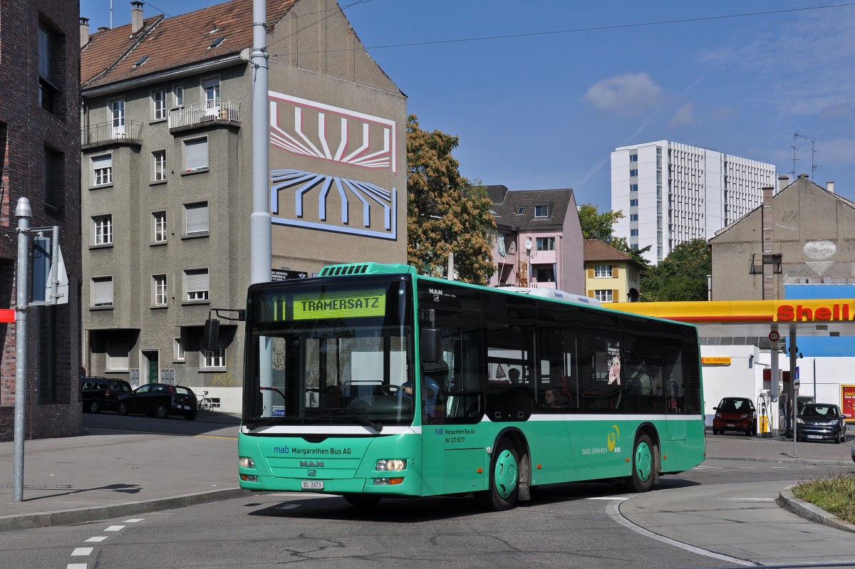 MAN Lions City von Margarethen Bus AG auf der Line 11 fährt zur provisorischen Haltestelle Bahnhof St. Johann. Die Aufnahme stammt vom 07.09.2014.