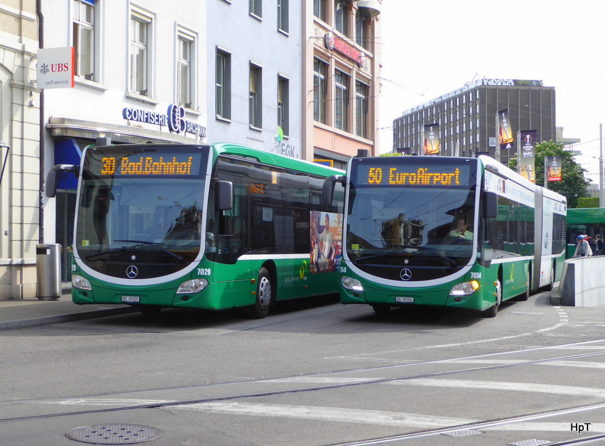 BVB - Mercedes Citaro Nr.7029 BS 99329 unterwegs auf der Linie 30 und Mercedes Citaro Nr.54 BS 99354 unterwegs auf der Linie 50 bei den Bushaltestellen vor dem Bahnhof in Basel SBB am 09.05.2016
