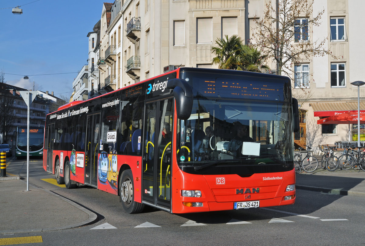 MAN Lions City von Südbadenbus, auf der Linie 38, fährt zur Haltestelle am Wettsteinplatz.