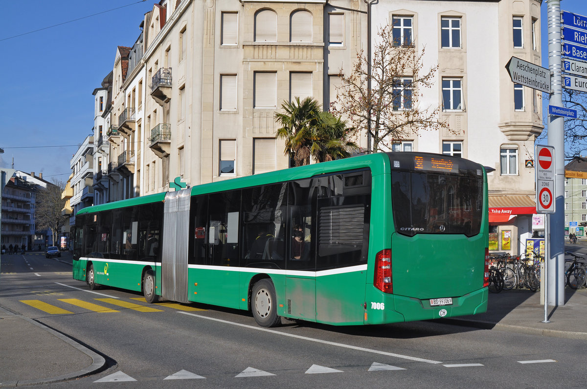 Mercedes Citaro 7006, auf der Linie 38, verlässt die Haltestelle am Wettsteinplatz Richtung Claraplatz. Die Aufnahme stammt vom 07.12.2016.