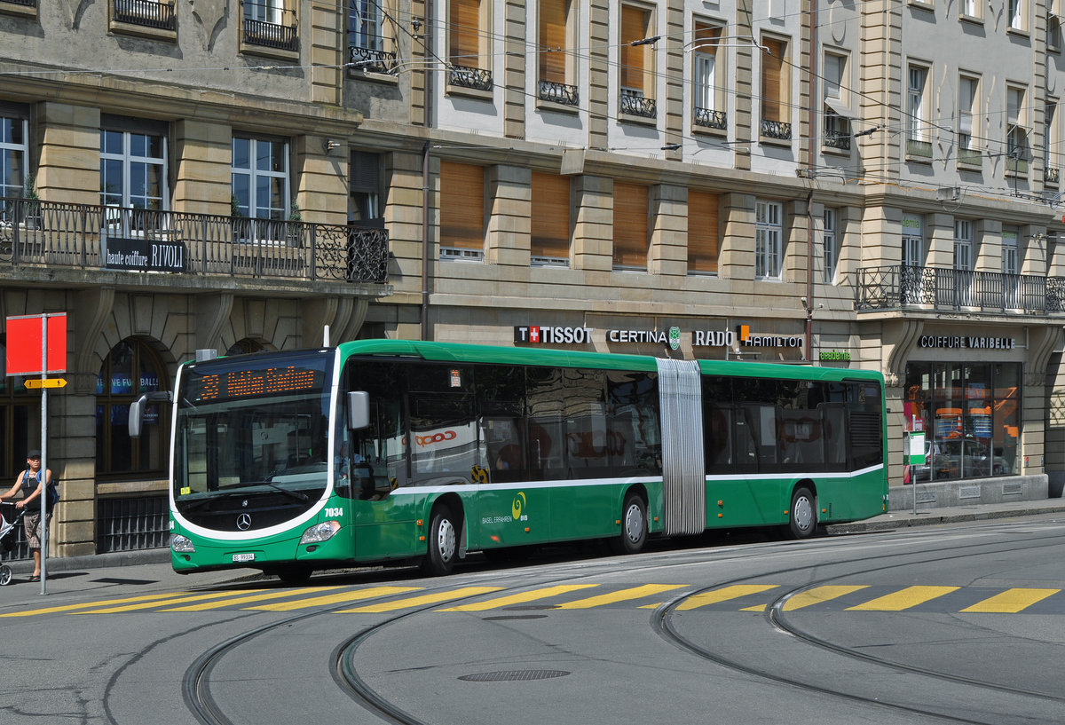 Mercedes Citaro 7034, auf der Linie 38, verlässt die Haltestelle an der Schifflände und überquert die Mittlere Rheinbrücke. Die Aufnahme stammt vom 27.06.2016.