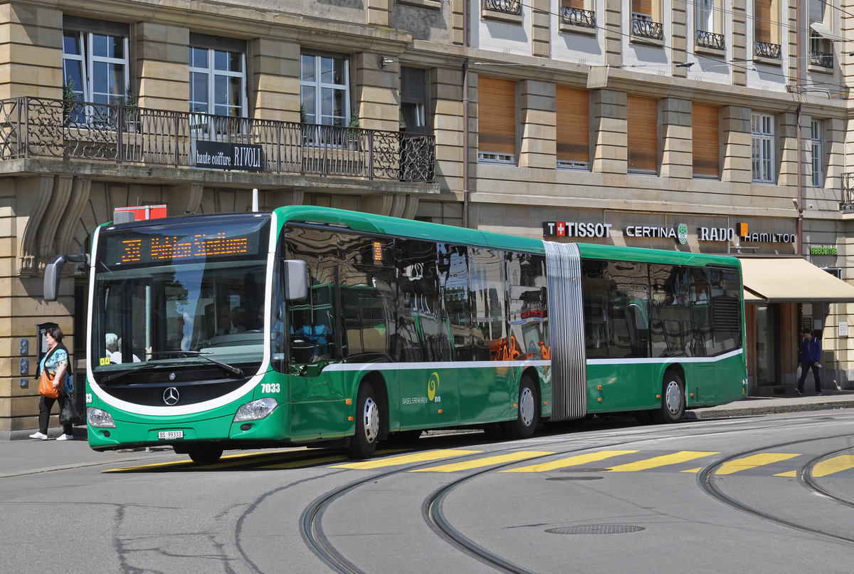 Mercedes Citaro 7033, auf der Linie 38, verlässt die Haltestelle an der Schifflände und überquert die Mittlere Rheinbrücke. Die Aufnahme stammt vom 27.06.2016.