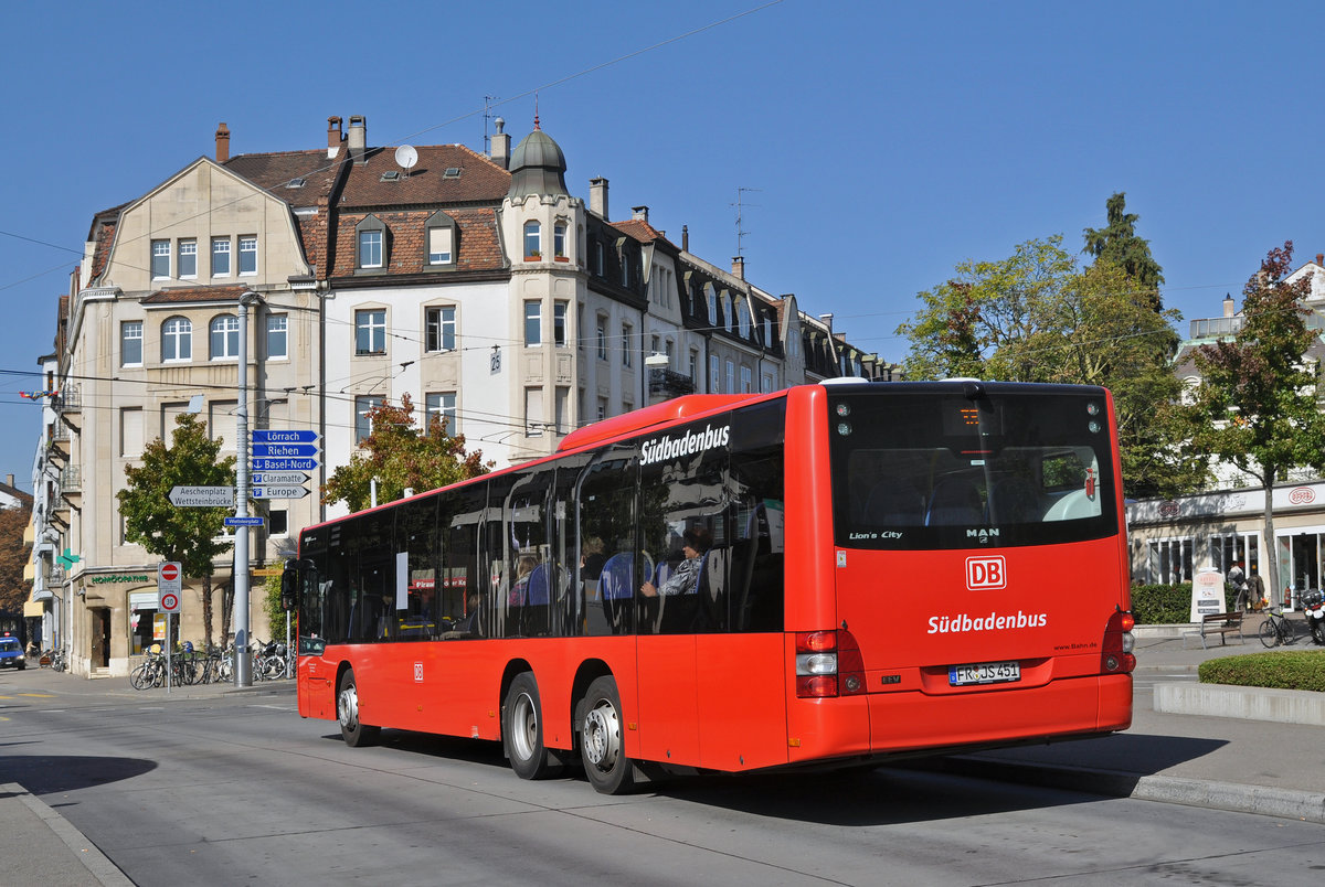 MAN Lions City von Südbadenbus, auf der Linie 38, bedient die Haltestelle am Wettsteinplatz. Die Aufnahme stammt vom 02.10.2015.