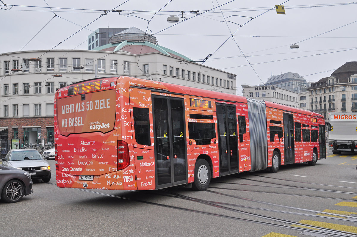Mercedes Citaro 7050, mit der easy Jet Werbung, fährt zur Endstation der Linie 50 am Bahnhof SBB. Die Aufnahme stammt vom 24.03.2017.