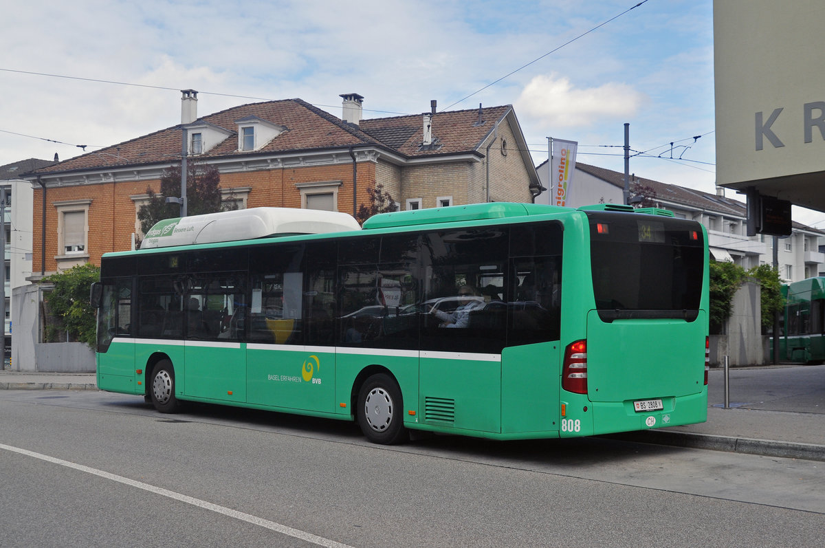 Mercedes Citaro 808, auf der Linie 34, bedient die Haltestelle beim Kronenplatz in Binningen. Die Aufnahme stammt vom 17.09.2017.
