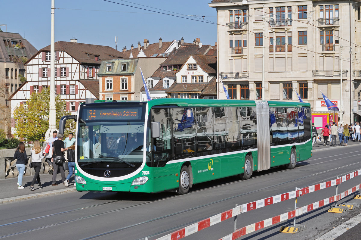Mercedes Citaro 7034, auf der Linie 34, überquert die Mittlere Rheinbrücke. Die Aufnahme stammt vom 14.10.2017.