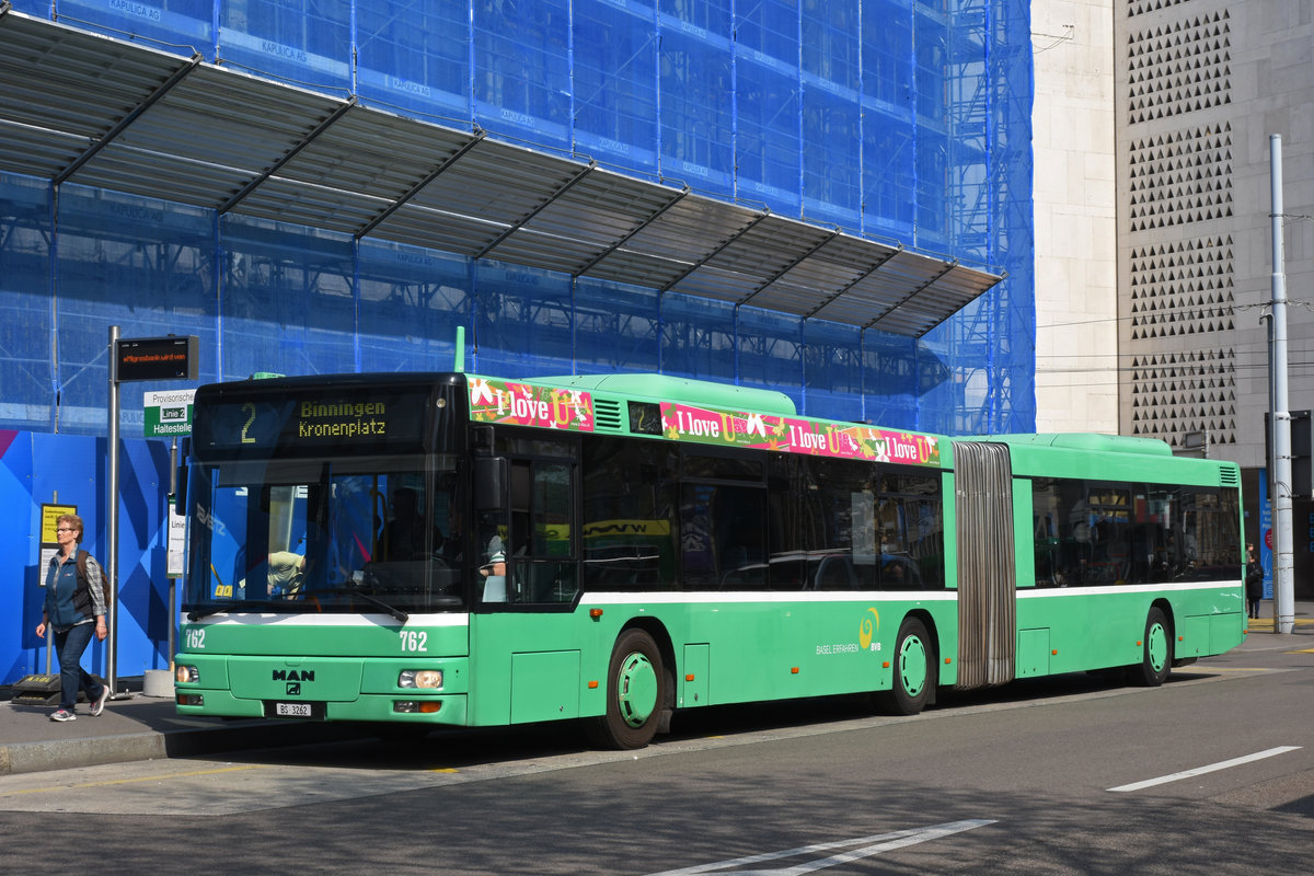 Wegen Bauarbeiten am Bahnhof SBB werden diverse Linien umgeleitet oder verlängert. Die Linie 2 wird vollständig mit Bussen betrieben. Hier bedient der MAN 762 die Haltestelle Aeschenplatz. Die Aufnahme stammt vom 28.03.2019.