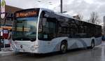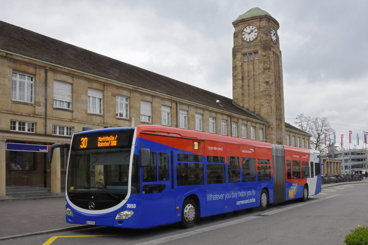 Mercedes Citaro 7053 mit der Werbung für die Cornercard und Britih Airways, auf der Linie 30, wartet an der Endstation am badischen Bahnhof. Die Aufnahme stammt vom 05.04.2019.