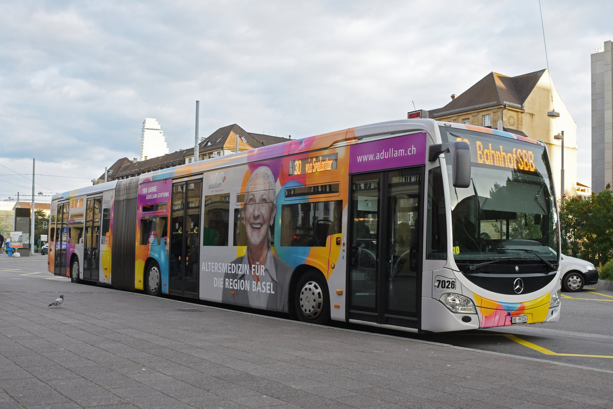 Mercedes Citaro 7026 mit der Werbung für 100 Jahre Adullam-Stiftung, auf der Linie 30, wartet an der Endstation am badischen Bahnhof. Die Aufnahme stammt vom 15.05.2019.