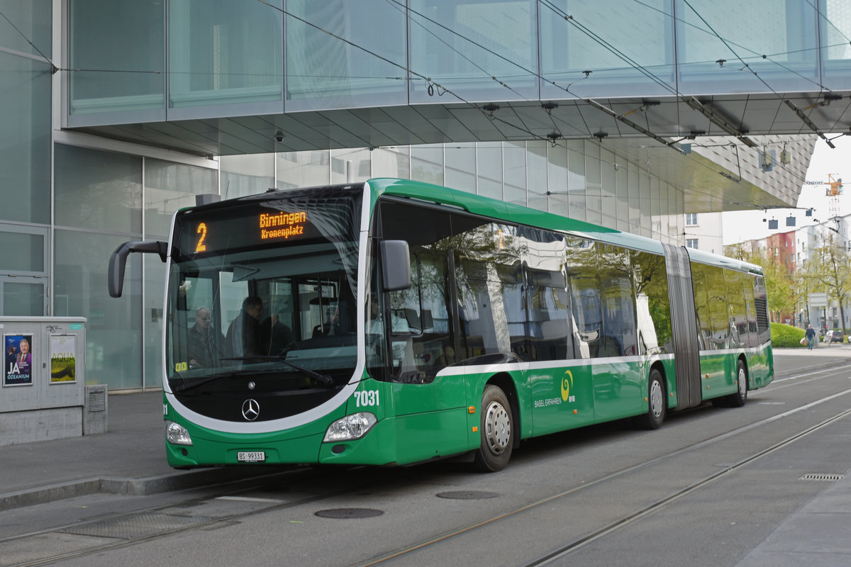 Wegen Bauarbeiten am Bahnhof SBB werden diverse Linien umgeleitet oder verlängert. Die Linie 2 wird vollständig mit Bussen betrieben. Hier wartet der Mercedes Citaro 7031 an der Endhaltestelle am Messeplatz. Die Aufnahme stammt vom 16.04.2019.
