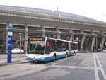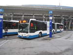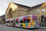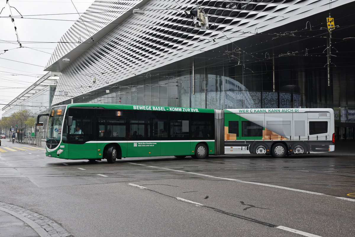 Wegen Bauarbeiten am Bahnhof SBB werden diverse Linien umgeleitet oder verlängert. Die Linie 2 wird vollständig mit Bussen betrieben. Hier fährt der Mercedes Citaro 7032 mit der Personalwerbung für neue Chauffeure für die BVB, zur Endhaltestelle am Messeplatz. Die Aufnahme stammt vom 14.04.2019.