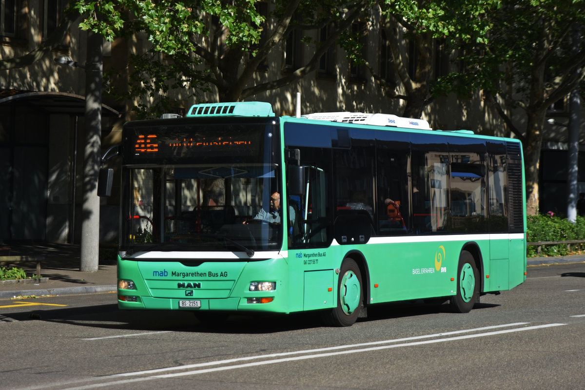 MAN Lions City der Margarethen Bus AG, auf der Linie 46, fährt zur Endstation am badischen Bahnhof.