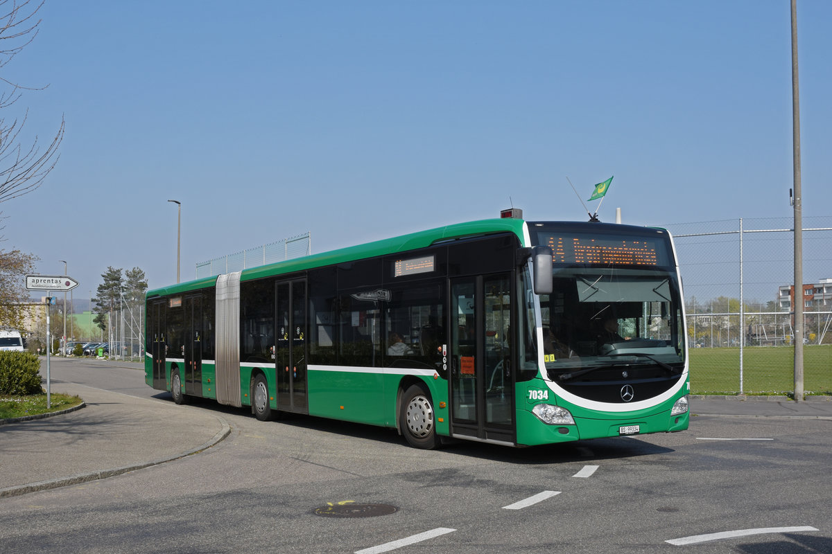 Wärend der Grossbaustelle zwischen Muttenz und Pratteln werden Busse als Tram Ersatz eingesetzt. Hier fährt der Mercedes Citaro 7034 zur Endstation an der Rothausstrasse. Die Aufnahme stammt vom 28.03.2020.