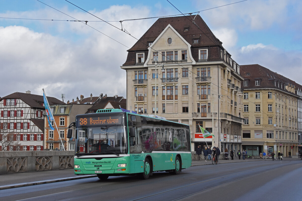 MAN Lions City der Margarethen Bus AG, auf der Linie 38, überquert die Mittlere Rheinbrücke. Die Aufnahme stammt vom 30.01.2022.