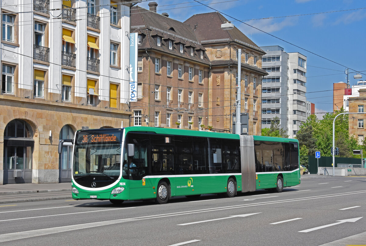 Mercedes Citaro 7024, auf der Linie 36, verlässt die Haltestelle beim badischen Bahnhof. Die Aufnahme stammt vom 03.05.2022.