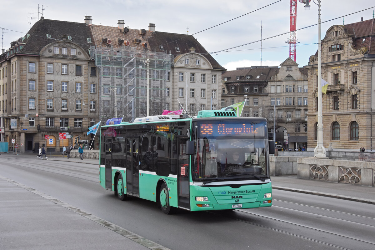 MAN Lions City der Margarethen Bus AG, auf der Linie 38, überquert die Mittlere Rheinbrücke.