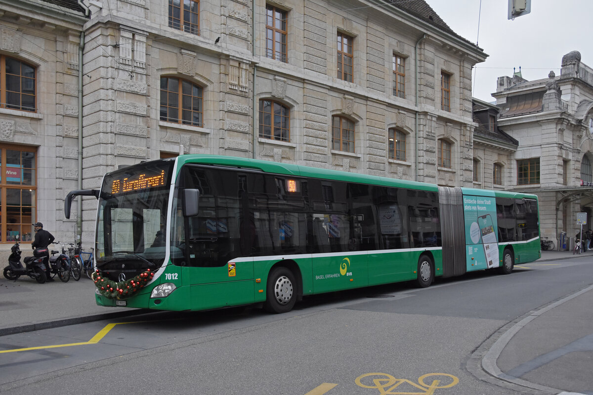 Mercedes Citaro 7012 mit einer Weihnachtsdekoration, auf der Linie 50, wartet am 03.12.2022 an der Endstation am Bahnhof SBB.