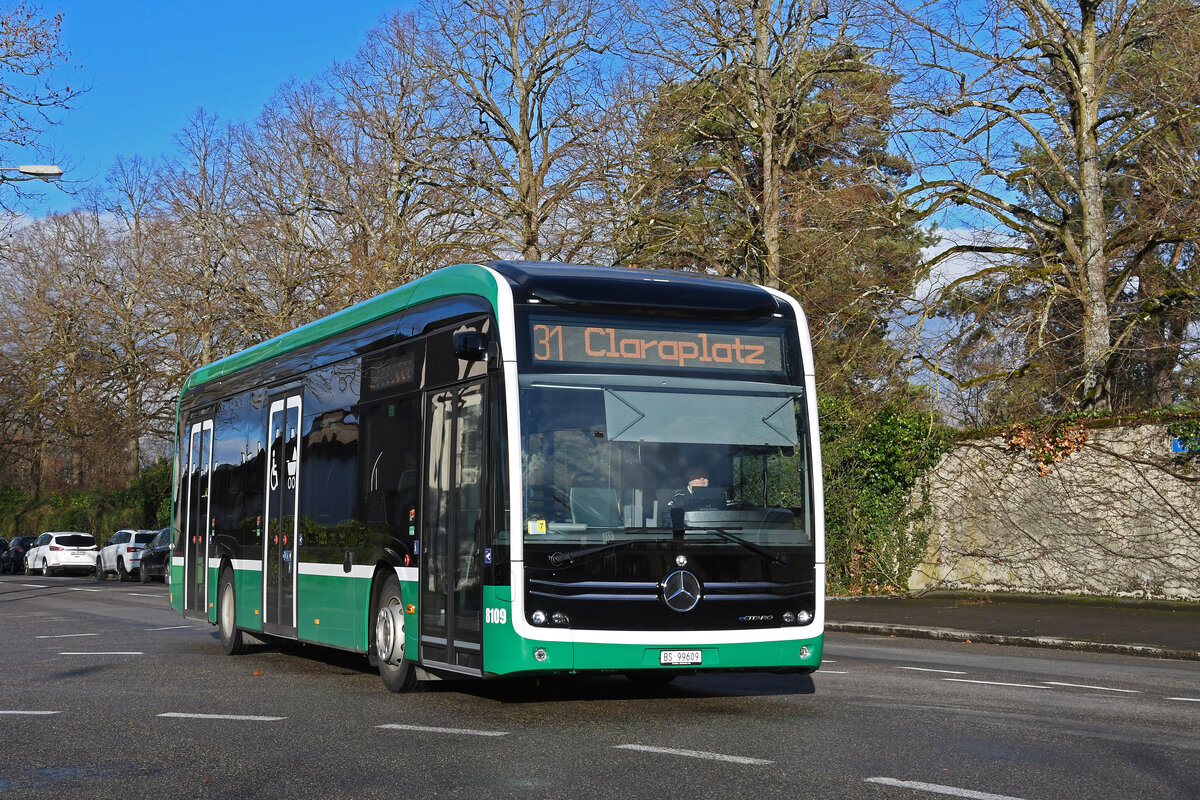 Mercedes eCitaro 8109, auf der Linie 31, fährt am 15.01.2023 zur Haltestelle Friedhof am Hörnli.