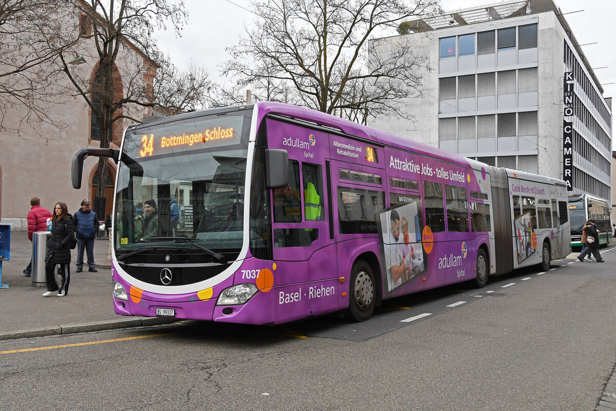 Mercedes Citaro 7037 mit der Adullam Werbung, auf der Linie 34, bedient am 28.01.2023 die Haltestelle am Claraplatz.