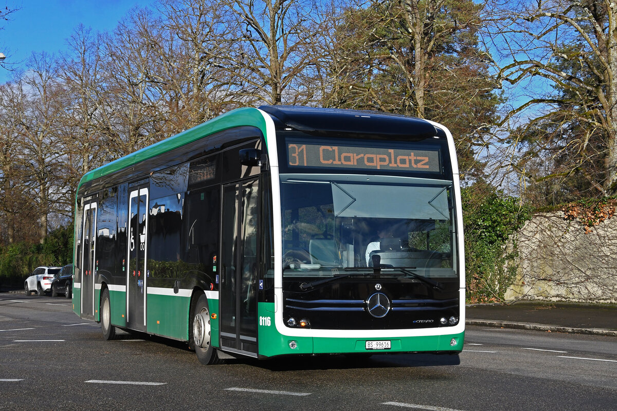 Mercedes eCitaro 8116, auf der Linie 31, fährt am 15.01.2023 zur Haltestelle Friedhof am Hörnli.