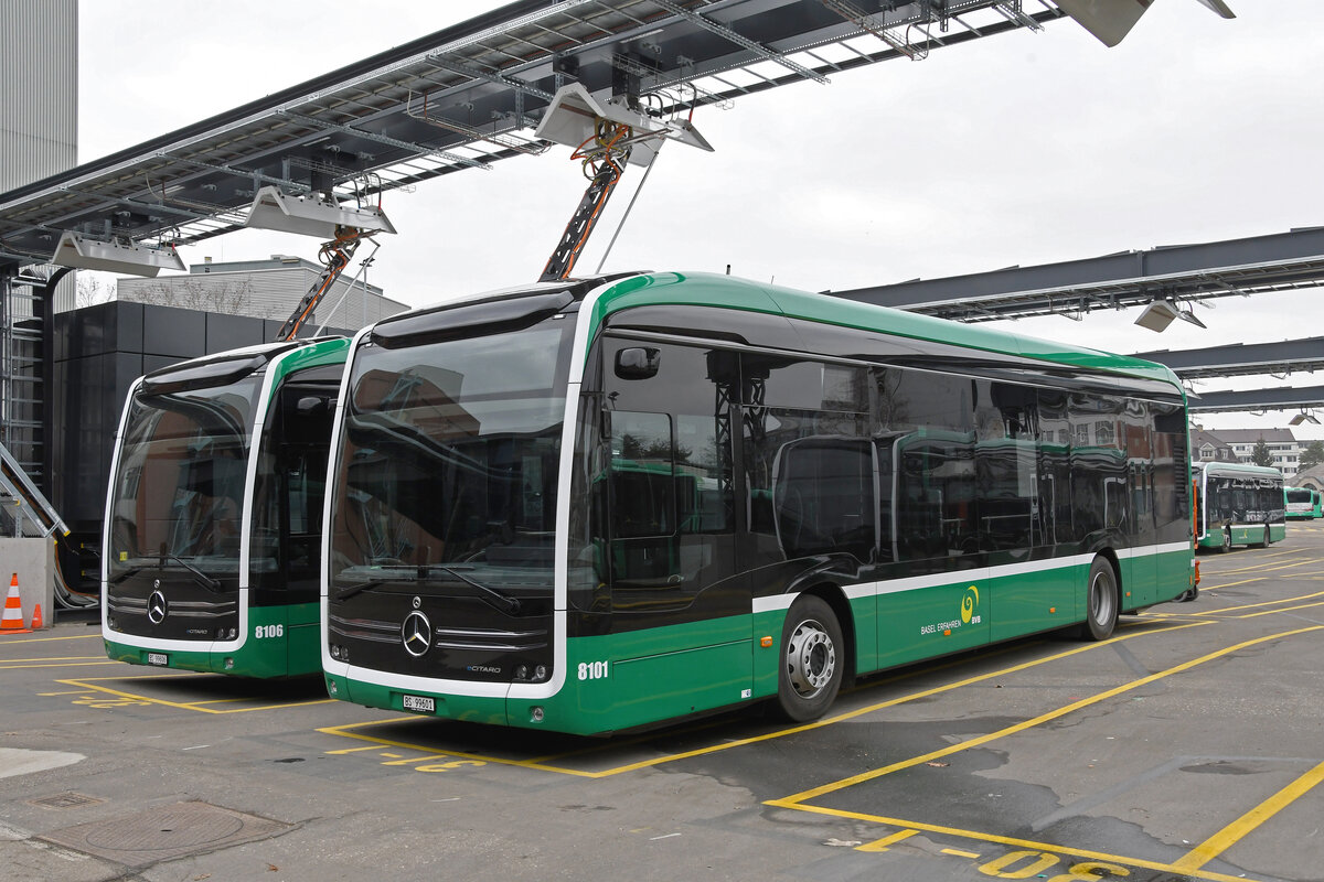 Am 27.01.2023 stehen die beiden Mercedes eCitaro 8101 und 8106 auf dem Klybeck Areal.