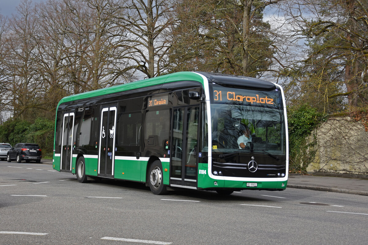 Mercedes eCitaro 8104, auf der Linie 31, fährt am 12.03.2023 zur Haltestelle Friedhof am Hörnli.