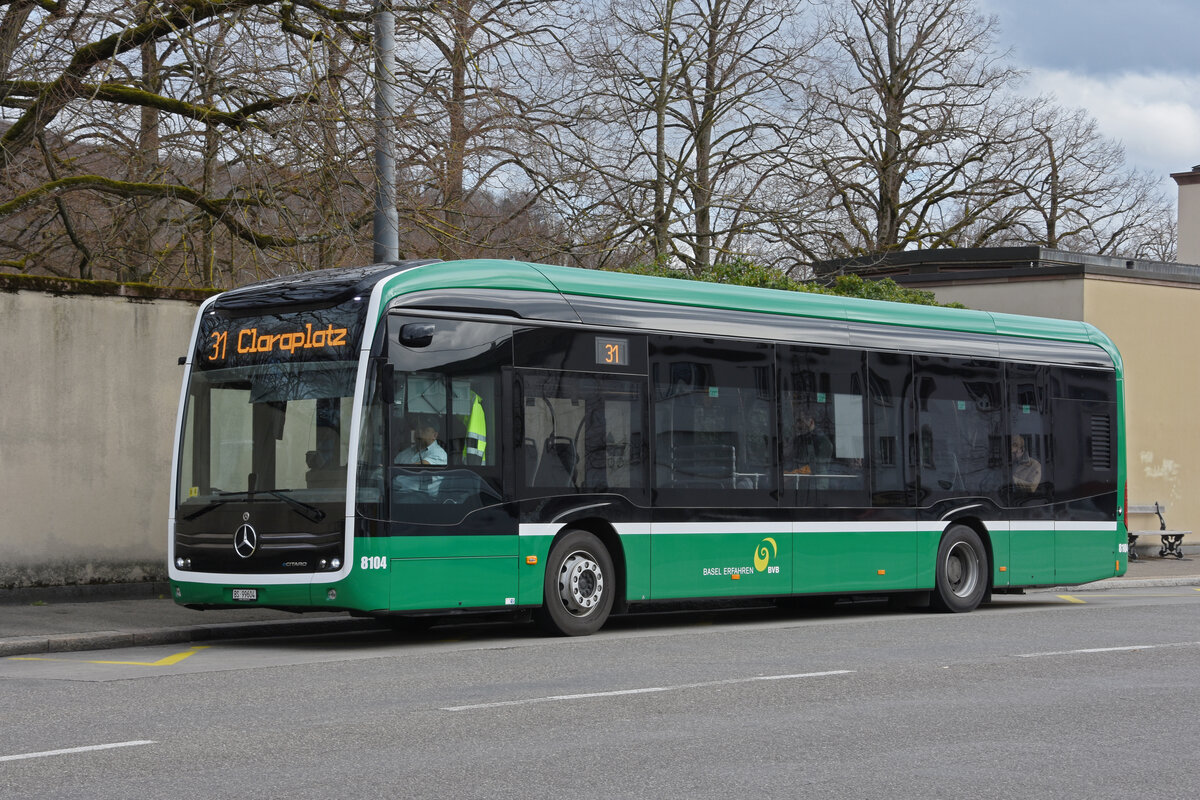 Mercedes eCitaro 8104, auf der Linie 31, bedient am 12.03.2023 die Haltestelle Friedhof am Hörnli.
