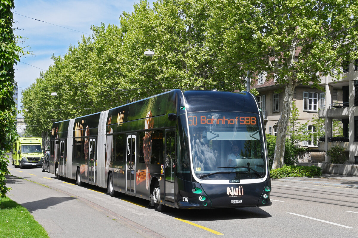 Hess Doppelgelenk Elektrobus 9101, auf der Linie 50, fährt am 22.11.2025 zur Haltestelle Brausebad. Aufnahme Basel.